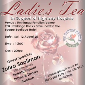 We are in full swing and have finalized the annual Hospice Ladies Tea. Before Covid, these were trendy events that we sold out very quickly, so get in early this year! Celebrate Life with us, and enjoy the fun, the entertainment, and the prizes as we share a morning with the ladies of Durban at the Umhlanga Function Venue.